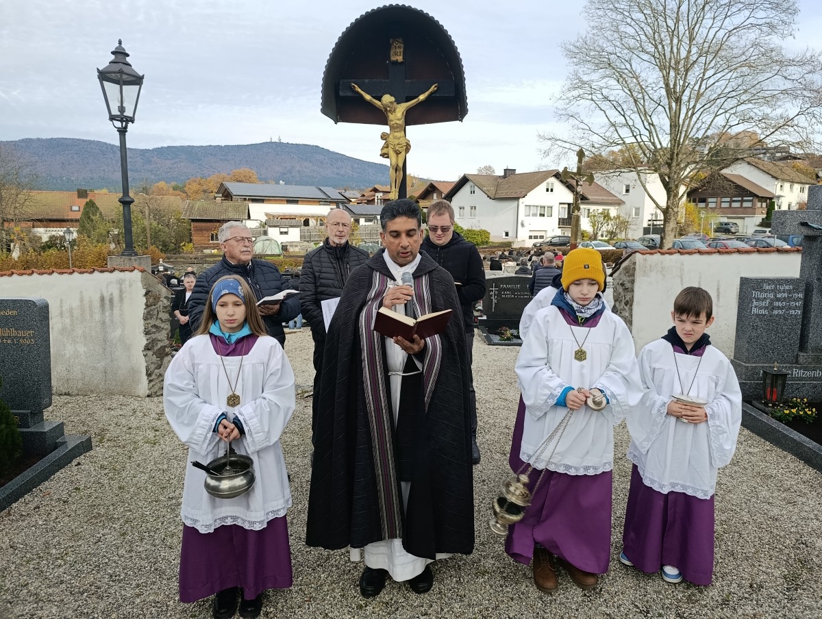Die Pfarrei Grafenwiesen feierte das Fest Allerheiligen und erinnerte an die verstorbenen Angehörigen, Verwandten und Freunde. Allerheiligen verbindet Himmel und Erde, verbindet die Menschen hier mit denen, die schon in Gottes Herrlichkeit sind. Den Gottesdienst am Vormittag begleitete Joachim Bauer musikalisch, die Lesung und die Fürbitten trug Bettina Pritzl vor, während Josef Ritzenberger, Rudi Kolbeck um Joachim Bauer am Nachmittag am Friedhof den Gesang übernahmen. In seiner Ansprache erläuterte Pater Georg die im Evangelium nach Matthäus gehörten Seligpreisungen. An Allerheiligen wird der Heiligen gedacht, die uns im Tod vorausgegangen sind und an Allerseelen aller Verstorbenen. Somit ist an Allerseelen das eigentliche Totengedenken. In der Andacht vor dem Friedhofsgang verlas Pater Georg die Namen der Menschen, die in unserer Gemeinde seit dem vergangenen Allerheiligen den irdischen Weg beendet haben, ihnen gilt unser besonderes Gebet: Greisinger Brigitte, Zach Hildegard, Greisinger Ingeborg, Dachs Elfriede Maria, Kloss Adelheid, Greisinger Rosina, Frisch Hilde, Häring Josef, Praller Maria, Dachs Franziska, Bablick Johannes, Zach Gottfried, Mühlbauer Renate, Richartz Franz, Schedlbauer Wolfgang, Zach Franz Xaver, Bode Peter. Auswärtig wurden bestattet: Staniewski Eugen, bestattet in Bad Kötzting und Daschner Wilfried, bestattet in Eschlkam. Für jeden Verstorbenen wurde eine Kerze entzündet. Die Gläubigen beteten am Friedhof für die Verstorbenen verbunden mit einem ehrenden Andenken und einem überzeugenden Glauben. Pater Georg segnete die Gräber mit Weihrauch und Weihwasser, während die Männerstimmen um Joachim Bauer die Litanei für die Verstorbenen sangen. Die Allerseelenandacht beendete die festlichen Tage. (hwp)