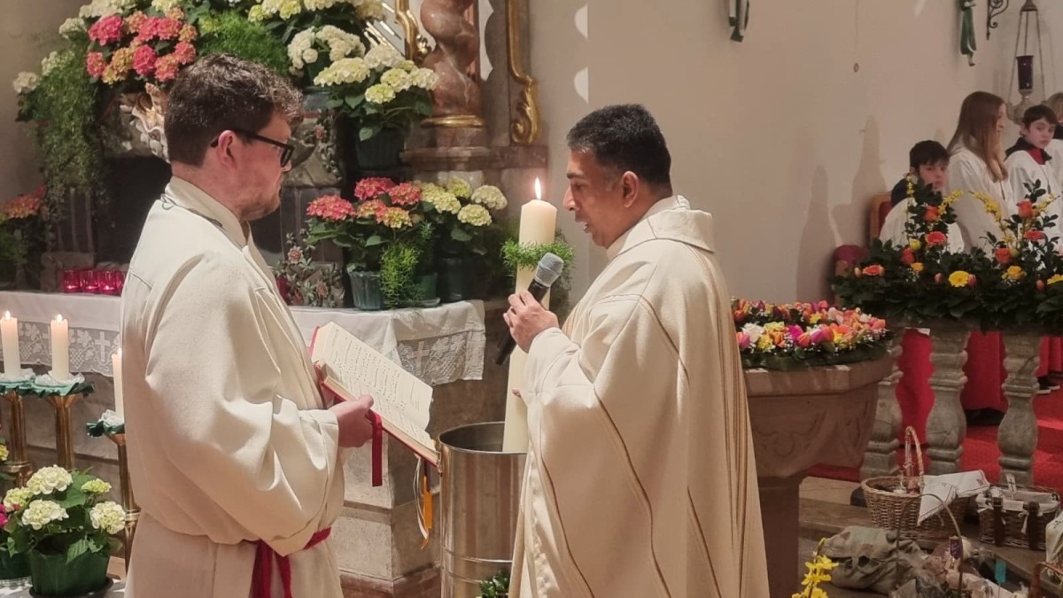 Das „Triduum Paschale“ (Ostertriduum) eröffneten Pfarrvikar Pater Georg Vettiyolil und die Ministranten am Abend des Gründonnerstages mit einem „großen Einzug“ zur Feier der Messe des letzten Abendmahls. Nach dem „Gloria“ verstummten Glocken und Orgel. Auch die heurigen Erstkommunionkinder feierten die Messe mit. Pater Georg segnete nach der Predigt sowohl die weißen Gewänder als auch die mit ihren jeweiligen Namen versehenen Kreuze, welche sie sämtlich zu ihrem großen Tag der Erstkommunion tragen werden, und übergab sie jedem einzelnen Kind. In einer kleinen Prozession wurden die in den „Leib Christi“ gewandelten Hostien zum rechten Seitenaltar gebracht. Pater Georg lud zur Beteiligung an denen sich anschließenden, zunächst vom Frauenbund und danach von der Marianischen Männerkongregation gestalteten Ölbergandachten ein.